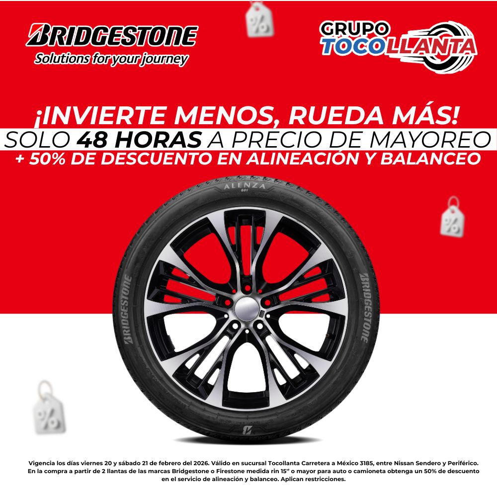 Vigencia los días viernes 20 y sábado 21 de febrero del 2026. Válido en sucursal Tocollanta Carretera a México 3185, entre Nissan Sendero y Periférico. En la compra a partir de 2 llantas de las marcas Bridgestone o Firestone medida rin 15’’ o mayor para auto o camioneta obtenga un 50% de descuento en el servicio de alineación y balanceo. Aplican restricciones.