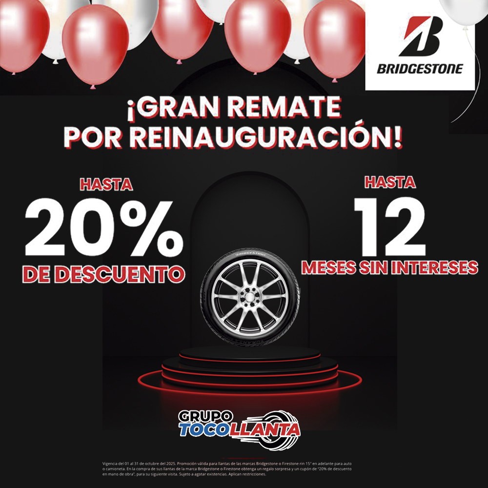 Vigencia del 01 al 31 de octubre del 2025. Promoción válida para llantas de las marcas Bridgestone y Firestone de rin 15” en adelante para auto o camioneta. En la compra de llantas de las marcas Bridgestone o Firestone obtenga un regalo sorpresa y un cupón de descuento del 20% en mano de obra, para su siguiente visita. Sujeto a agotar existencias. Aplican restricciones.